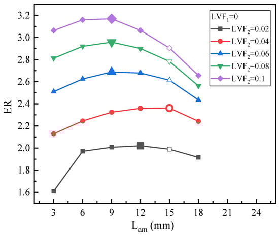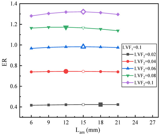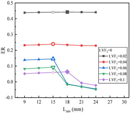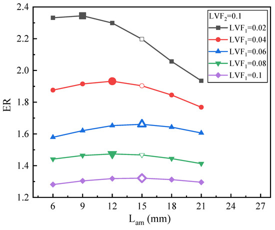 Figure 20 presents the effect of Lam on ER under fixed LVF2 of 0.1 and various LVF1 (0.02–0.1). Obviously, for LVF1 = 0.02, 0.04, and 0.06, it can be seen that the change in ER is relatively evident, while for LVF1 = 0.08 and 0.1, the change in ER is pretty small. The results are similar to the variation of the optimal Lam with LVF in Figure 16, Figure 18 and Figure 19, namely the changing trend of optimal Lam is irregular.