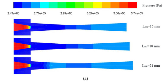 With the results of Section 3.2, it can be found that the relation of optimal Lam with LVF1 and LVF2 is irregular since optimal Lam is influenced by optimal Lpm. When the optimal Lpm is more than 8 mm, the optimization of Lam is not evident, or the influence of Lam is not distinct. Nevertheless, when the optimal Lpm is less than 8 mm, the influence of Lam will be significant. The optimum Lam are in the range of 6–21 mm, and they do not deviate much from the Lam of the baseline ejector model (15 mm).