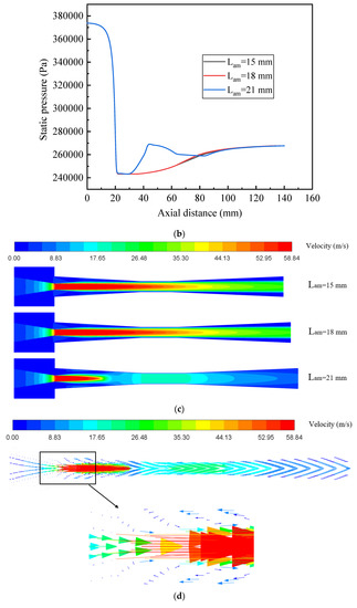 Pressure inside the ejector with different Lam under LVF1 = 0.1 and LVF2 = 0: (a) Contour of static pressure; (b) Static pressure along the centerline; (c) Contour of velocity and (d) Velocity vector field of Lam = 21 mm.