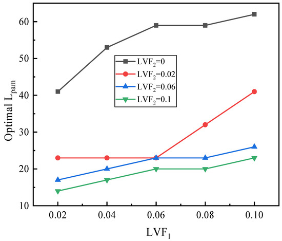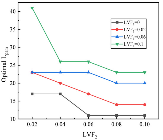 Figure 21 depicts the relation of the sum of optimal Lpm and Lam (Lpam) with LVF2 under changed LVF1. It can be observed that for each LVF1, the optimal Lpam decreases with LVF2. Furthermore, the optimal Lpam increases with LVF1.
