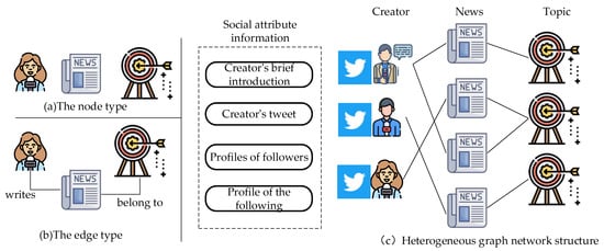 Traditional judgment of political stance mostly starts from the content, but it is difficult to detect the bias in the news. News creators often express their positions obscurely, which prevents the traditional language model from being able to identify their political stance correctly [2]. Social network communication of news and the entity background knowledge map involved in the news are closely related to political views. These characteristics ensure that news position detection should not only remain in its content. We can excavate more useful information from different angles to enhance the judgment of the news stance [3]. Some works have introduced various external information, including selecting entities in the news to introduce the existing knowledge graph and constructed political knowledge graph for position discrimination or relying on spread of news in social media for news position discrimination [4]. This paper still starts from the social network, relies on the relationship between the news and the author, and introduces the author’s rich social background information to distinguish the news stance. For example, the creator of a news piece will show his political stance when he writes the news, and his related remarks and relationships on social media can also reflect his political stance. At the same time, the news topic can increase the news’s relevance. Therefore, collecting relevant information is meaningful in judging the news’s political bias. To make more effective use of the above information, we combine news, topic, and author information and model them as heterogeneous networks with a strong ability to express rich information. In this work, we model the problem of news political stance discrimination as the classification of news nodes in heterogeneous networks. Figure 2a includes the type of nodes appearing in the graph, Figure 2b includes the type of edges in the graph, and Figure 2c describes the heterogeneous network instance in this scenario.