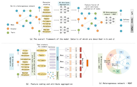 In this manuscript, the overall framework of the model is shown in Figure 3a. Figure 3b,c includes the details of the model. An end-to-end learning process is designed to build a heterogeneous network for all news, creators, and topics. The overall framework is specifically divided into the following parts: (1) construct a heterogeneous network containing the multi-attribute information of nodes; (2) aggregate the multi-attribute information of a single node to obtain node feature vectors; (3) use the two-layer attention heterogeneous network model to aggregate node features; (4) obtain the final feature representation of news nodes, and then classify the political stance of news.