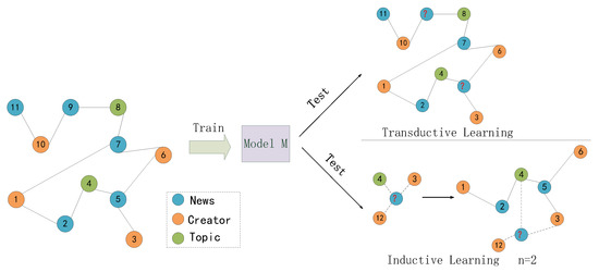 The specific method of inductive learning of the heterogeneous graph neural network can be described as shown in Figure 5. First, a graph network is constructed by relying on the existing training and testing data, and the aggregation function is obtained by relying on the graph training. A new heterogeneous network is established according to its author and topic information for a newly added news node. Nodes that are the same as and (i.e., nodes 3 and 4 in the figure) are used for N-hop neighbor expansion. The extended nodes and news nodes to be judged are added to the heterogeneous network to obtain the extended inductive graph .