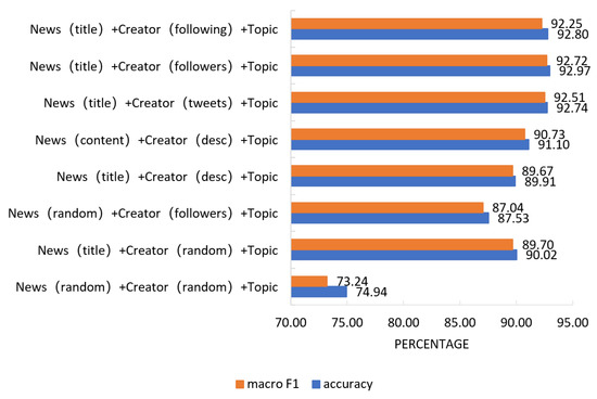 In this experiment, the single attribute features of nodes are used in the constructed heterogeneous network. The three attributes defined in Section 3.1 are used by news, and the creators use the five attributes defined in Section 3.1. In order to prove the effectiveness of the node attributes selected in this paper, random coding was used to eliminate attribute information. The partition ratio of the 8:1:1 training set, validation set, and test set was used to study the importance of attributes by taking direct inference learning as an example, and experimental results, as shown in Figure 6, were obtained. The results show that accuracy of 74.94% and value of 73.24% macro F1 can be achieved using only heterogeneous networks without any attribute information injected. In the experiment with the single attribute information of news or the single attribute information of the creator, the experimental results are greatly improved, indicating that the attribute features we selected can improve the discriminant accuracy of news stances to a certain extent.