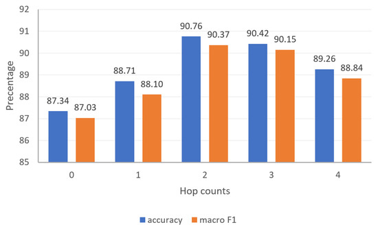 This section discusses the influence of inductive graphs constructed with different hop counts on the experimental results. The Figure 7 shows the accuracy and macro F1 value of inductive graphs constructed with hop counts from 0 to 4 for discriminating the stance node of news nodes. It can be seen from the results that the effect is poor when the hop count is 0 because the original label data are not used. Nevertheless, the representation of node characteristics can still help to judge test set node categories. The increase in hops improves the effect because the constructed inductive graph uses the existing label news data information. The gradual decrease in the number of hops starting from 3 is due to linking too many noisy nodes, affecting the feature representation of the central node.