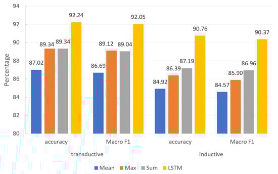 In order to verify the effectiveness of the attribute fusion method designed in Section 3.2.2, the three attribute features of the news node are fused, and the five attribute features of the creator node are fused. The fusion strategy is to take the average of the multi-attribute features of a single node, take the maximum feature value, sum the feature value, and aggregate the multi-attribute information through Bi-LSTM. The experimental results shown in Figure 8 are obtained for transductive and inductive learning, respectively.