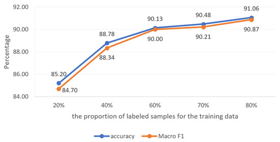 In this section, the multi-attribute features of all nodes are fused and used as the final feature vector to construct a heterogeneous network graph. This manuscript will study the influence of the proportion of news stance tags on the experimental results. The fixed test sample size remains unchanged, and the proportion of labeled samples for the training data is set as 20%, 40%, 60%, 70%, and 80%, respectively. The experimental results are shown in Figure 9. It can be seen that the coding method of fusing multi-attribute features designed in this manuscript can well represent the position characteristics of news nodes. Through fusion of heterogeneous networks, the data of labeled nodes are effectively used to enhance the feature representation of associated nodes. At the same time, in the case of only small sample data labels, relying on this feature representation method and heterogeneous network model, better classification results can still be obtained in the transductive learning network.