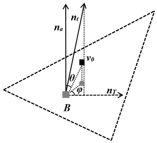 Based on the aforementioned normal vectors and , a customized local spherical coordinate system can be established as shown in Figure 3. Taking the centroid B (assuming its original coordinates are ) as the origin of the defined local spherical coordinate system, the plane determined by the centroid B and the normal is taken as the projection plane. The normal serves as the local spherical coordinate system’s Z-axis, while the projection of the normal onto the projection plane serves as the local spherical coordinate system’s X-axis. Furthermore, the mean distance l from the centroid B to the first-ring neighboring points is computed. The ratio between the distance from the model vertex v0 to the centroid point and l is denoted as r. The angle between the model vertex v0 and the positive direction of the Z-axis is referred to as θ, while the angle with the positive direction of the X-axis is denoted as φ. The customized spherical coordinate transformation formula is as follows: