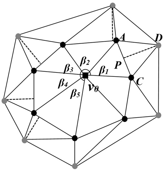 The second-ring neighboring points selected based on the aforementioned conditions are referred to as preliminary filtered points. An embedding unit can be formed by combining the base point, preliminary filtered points, and the two first-ring neighboring points connected to them. This unit comprises four vertices, creating two triangular facets. The base edge of these triangles is formed by connecting the two first-ring neighboring points, and the angle at the base point’s triangle is denoted as β. As depicted in Figure 4, the angle β falls within the range of . Considering the relatively limited occurrence of extreme values in the distribution of angle β, further refinement is conducted in the selection of filtering points. The points selected for filtering should correspond to β values within the range of , where “a” is slightly greater than 0 and significantly less than 1, while “b” is slightly less than 1 and notably greater than 0.