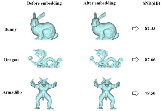 In this paper, the first watermark selected for the primary layer has a size of 40 × 40 pixels and consists of a binary image depicting the letter “L.” The secondary watermark, on the other hand, comprises a random binary sequence of 32 bits. The experimental models which we employed are simplified versions of the bunny, dragon, and armadillo 3D mesh models from Stanford University’s 3D Mesh Repository. As shown in Figure 6, the three models on the left represent the models before watermark embedding, while the one in the middle represents the model after watermark embedding. It is challenging to visually observe any significant changes in the model. The calculated signal-to-noise ratios (SNR) caused by embedding the watermarks were 82.33, 87.66, and 78.50 dB, respectively. This indicates that after watermark embedding, the imperceptibility of the watermark was good.