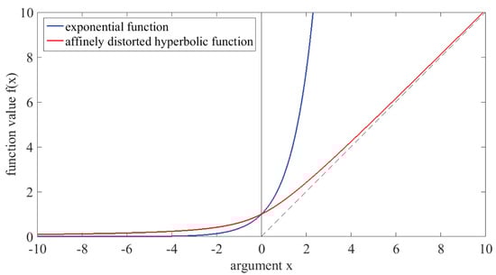 The first of these observation functions, simply an exponential function, has been chosen with the intention of achieving non-negativity of the observed data, as it may also be achieved in Poisson regression. The disadvantage of this choice for the observation function is the fact that it diverges exponentially for large positive arguments. In previous work, we have occasionally encountered numerical breakdown of Kalman filtering algorithms due to the resulting extremely large values [,]; details will be provided below in Section 3.1. For this reason, we propose a different nonlinear observation function, to be called the “affinely distorted hyperbolic” function, as given in Equation (6); while for negative arguments it behaves like the exponential function, for positive arguments it converges to the linear function, rising with a slope of , see Figure 1.