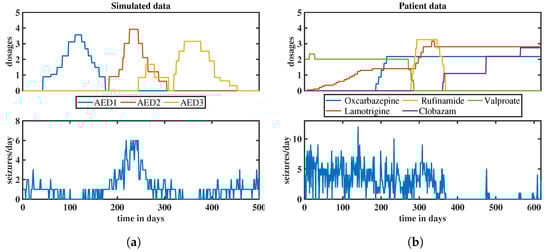The time-dependent dosages of the drugs during the chosen time interval of 618 days are shown in the upper panel of Figure 2b, while the recorded time series of the daily numbers of seizures is shown in the lower panel of the figure. During the chosen time interval, five different anti-epileptic drugs were administered: oxcarbazepine, lamotrigine, rufinamide, clobazam, and valproate.