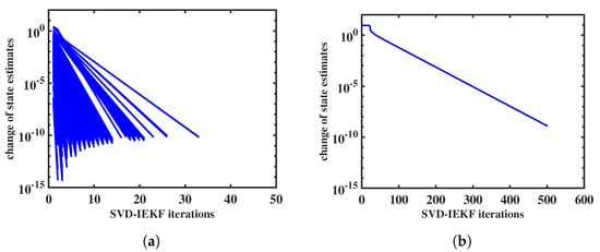 Square-root variants of the Kalman filter that employ CD were proposed already in the 1960s. However, SVD represents a matrix decomposition that offers superior numerical properties, compared with CD. Square-root variants of the Kalman filter that employ SVD were proposed in 1992 by Wang et al. [], and in 2017 by Kulikova and Tsyganova []. In an earlier paper, we proposed a square-root variant of the IEKF that employs SVD [], based on the algorithm of Kulikova and Tsyganova.
