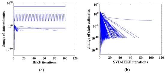 In Figure 4, we illustrate the effects of loss of positive definiteness of covariance matrices on the convergence behavior. Also, this example refers to the analysis of the simulated data. The standard IEKF was used, as described above in Section 2.3, and the affinely distorted hyperbolic function was employed.