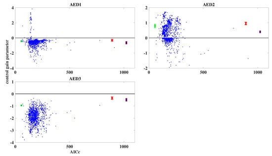 Following earlier work [], we plot the control gain parameters, i.e., the diagonal elements of the control gain matrix, , as defined in Equation (3), against the corresponding values of the AICc for all models of the ensemble; for each diagonal element, i.e., for each anti-epileptic drug, a separate plot is created. For the simulated data, the resulting plots are shown in Figure 5; blue dots represent the results from the 1000 models of the ensemble. The model with the lowest AICc value is highlighted in green. In addition, the results obtained by the two non-dynamic regression models are also shown, and are represented by red (Gaussian) and deep purple (Poisson); error bars are also shown, although they are mostly very small.
