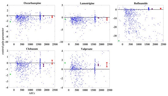As an example, consider again Figure 6. For each of the five anti-epileptic drugs displayed, it can be seen that the majority of the blue dots correspond to the same sign of the control gain parameter as the best model (i.e., the dot highlighted in green), thereby lending additional credibility to the resulting conclusions on the effects of these drugs. If, in such a case, the blue dots were distributed about equally over positive and negative values of the control gain parameter, we would be less inclined to regard the sign of this parameter for the best model as significant.