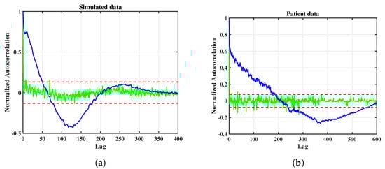 In Figure 7, the autocorrelation functions for the innovations of the simulated data (left panel) and the patient data (right panel) are shown (green curves); for comparison, the autocorrelation functions of the raw data are also shown (blue curves). The red dashed lines correspond to one standard deviation. Note that, at lag zero, autocorrelation functions always assume a value of . By comparison of the blue and the green curves it can be seen that, both for simulated data and for patient data, very good whitening has been achieved, with only a few outliers exceeding one standard deviation. This result confirms the validity, in a statistical sense, of the chosen approach of modeling the data by a state space model with a nonlinear observation function.