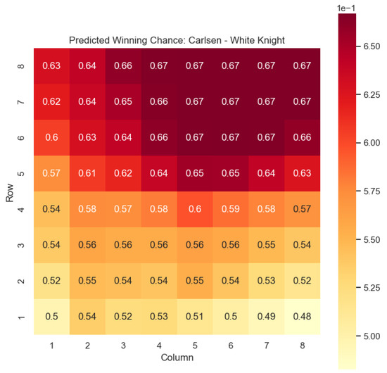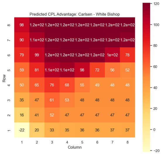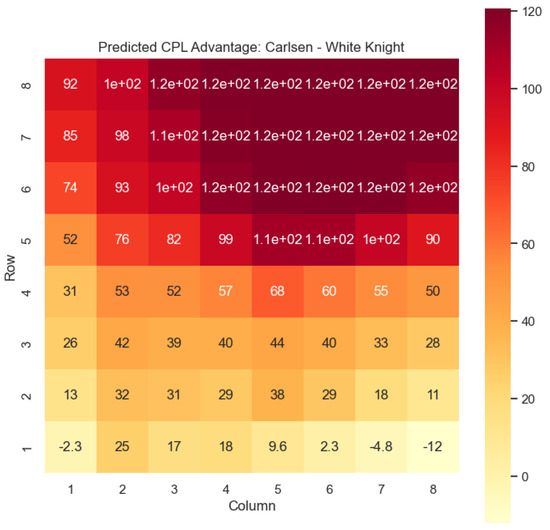 The predictions generated by the model offer a quantitative measure of the advantage/disadvantage provided by the knight and bishop pieces in specific states encountered by Magnus Carlsen. Heat maps depicting the predicted centipawn evaluations and winning probabilities are presented for both White and Black knights and bishops in Carlsen’s games. These visual representations provide a comprehensive overview of the relative strengths and weaknesses of these pieces in various positions as encountered by Carlsen.