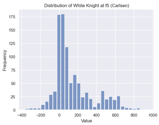 In Figure 12, we discover the solution to one of the questions raised in Section 1: the value of the White knight on . Figure 20 illustrates the distribution of for the White knight on in Carlsen’s games. It is evident that the values for the White knight exhibit a positive skew, indicating that this particular state s is typically associated with favorable values. Therefore, having a White knight positioned on often confers an advantage.