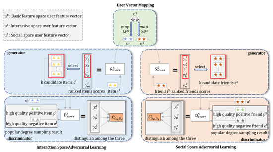 The “User Vector Mapping” module contains the user’s basic feature vector uB and two mapping functions MB−I and MB−S. First, the user’s base feature vector uB is mapped through the mapping function MB−I to the interaction space, to obtain the user vector in the interaction space uI. At the same time, the user base feature vector uB is mapped to the social space by the mapping function MB−S to the social space, to obtain the user expression in the social space uS. Finally, the uI and uS are input to the “Interaction Space Adversarial Learning” module and the “Social Space Adversarial Learning” module, respectively, for adversarial training.