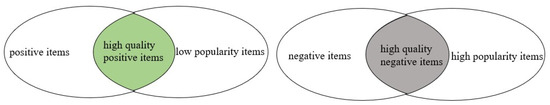 According to the definition of popularity, we believe that among the positive examples of items that users have interacted with, the low-popularity items represent the users’ true interest preferences. Similarly, among the negative example items that the user has interacted with, the high popularity items reflect the user’s true aversion tendency. Therefore, the high-quality positive items, will be obtained by intersecting the user’s positive items with the low-popularity items, and similarly, the high-quality negative items, , will be obtained by intersecting the user’s negative example items with the high popularity items, as shown in Figure 2.