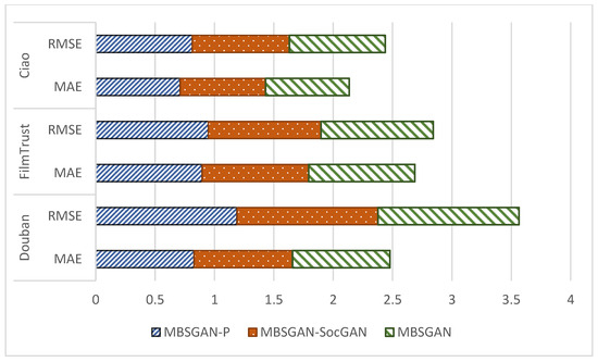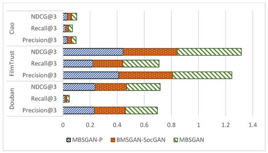 By observing the experimental results in Table 3, it can be seen that the MBSGAN proposed in this paper obtains optimal values in terms of each metric in the Douban, FilmTrust, and Ciao datasets compared to the baseline model. Further analysis of the experimental results leads to the following conclusions: Diffnet++, RSGAN, DASO, ESRF, and MBSGAN perform better compared to the traditional social recommendation method SBPR because the four baseline models of the latter incorporate the network model in deep learning, because deep learning models have multiple layers and nonlinear activation functions that can capture complex nonlinear relationships between users and projects. Traditional recommendation models often rely on linear or shallow models, which cannot effectively capture the complex and nonlinear nature of user–item interactions. And compared with SBPR, which only considers the first-order neighbors of users, the use of network models can tap more information about user–item interactions and the association information in social relationships to obtain a richer user representation. Compared with RSGAN and ESRF using GAN, DASO and MBSGAN outperform these two models in all metrics, indicating that RSGAN and ESRF share the same user representation in both interaction and social spaces, which limits the learning of user representation, while DASO and MBSGAN learn user representation in the social space and interaction space separately to learn more fully the information in each space. This is because learning user expressions separately can reduce irrelevant interference. Separating user representations in social spaces and interaction spaces can avoid interference between spaces and improve the independence and accuracy of the model for information in each space. The MBSGAN model performs better than DASO, demonstrating the effectiveness of basic feature space mapping.