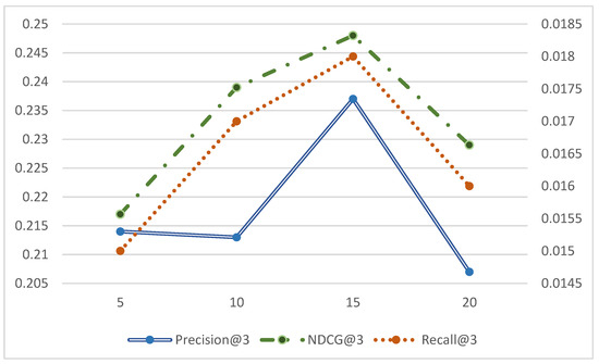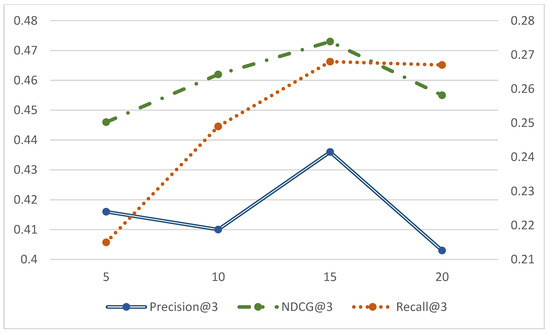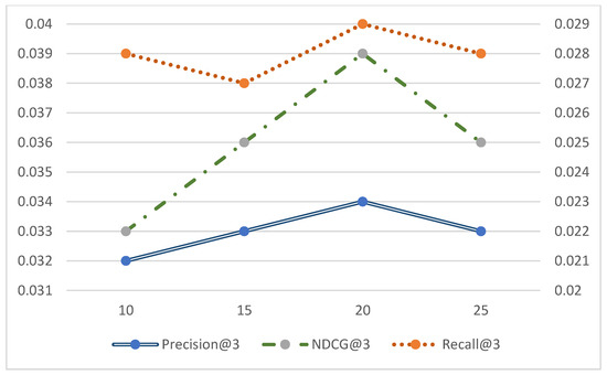 In order to present the results of Precision@3, Recall@3, and NDCG@3 with the number of candidate samples clearly in the same plot, the horizontal coordinates are set as k values and the vertical coordinates are the evaluation values, here the vertical coordinates are used as the primary and secondary axes. The blue line represents Precision@3, the green line represents NDCG@3, and the orange line represents Recall@3. In Figure 5, Figure 6 and Figure 7, the values of Precision@3 and NDCG @3 are based on the main axis on the left, and the Recall@3 values are based on the secondary axis on the right.