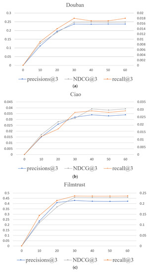 To verify the convergence of the model, we conducted experiments on three datasets: Douban, Ciao, and FilmTrust to obtain the learning curve of the MBSGAN model. Among them, the principal axis represents precision@3 and NDCG@3. The secondary coordinate axis represents recall@3 and the horizontal axis represents the number of epochs.