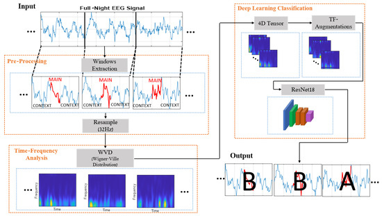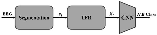 The proposed method consists of three main building blocks (Figure 3), which align with these factors. The first component involves pre-processing, where each analyzed 1 s EEG is treated as a more extended time window. This window contains the central part we want to classify, along with the near vicinity of the signal that is added to provide contextual information. Each 1D-EEG segment is transformed into a 2D time-frequency matrix in the second stage. This representation captures the non-stationary signal’s energy and spectral content, which vary over time. From this point, the obtained 2D time-frequency representations are treated as images, and the proposed method adopts a deep learning framework. In line with that, the received images are stacked into 4D tensors, normalized, and augmented to preserve their time-frequency structure. The processed images are finally fed into a CNN-based architecture for training in a supervised manner. Next, we detail each of these components.