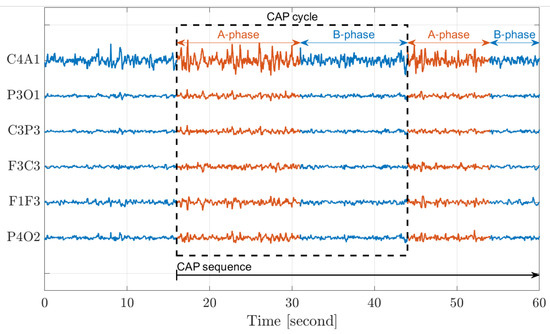 According to the guidelines set by the American Academy of Sleep Medicine (AASM) [33], sleep is typically classified into five stages that characterize sleep’s macrostructure. These stages include Wakefulness (W), Rapid-Eye-Movement (REM), and Non-Rapid-Eye-Movement, which consists of three interior stages (Non-REM S1–S3). In 2001, the concept of cyclic alternating patterns (CAP) was introduced [2] to characterize the microstructure of sleep. CAP represents a periodic EEG activity that occurs during Non-REM sleep and is characterized by cyclic sequences of cerebral activation (A-phase) followed by periods of deactivation (B-phase) [1]. An A-phase period and the following B-phase period define a CAP cycle; at least two CAP cycles are required to form a CAP sequence. Figure 2 demonstrates CAP in sleep. The figure displays data from six distinct EEG channels (C4A1–P4O2), each spanning a duration of 60 s. The A-phase (red) period and the subsequent B-phase (blue) period define a single CAP cycle, while the consecutive cycles collectively define a CAP sequence.