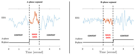 Since each EEG segment is an extension of its central second, for all window lengths, the label assigned to each segment is determined solely by the label of its central second, regardless of the labels of its other components. For instance, a 5 s segment composed of 2 s of B-phase followed by 3 s of A-phase would be labeled as an A-phase segment due to its central A-phase second, while on the other hand, a similar 5 s segment made up of 3 B-phase seconds at the beginning followed by 2 A-phase seconds, would be designated as a B-phase segment due to its B-phase center. These two scenarios are illustrated in Figure 4.