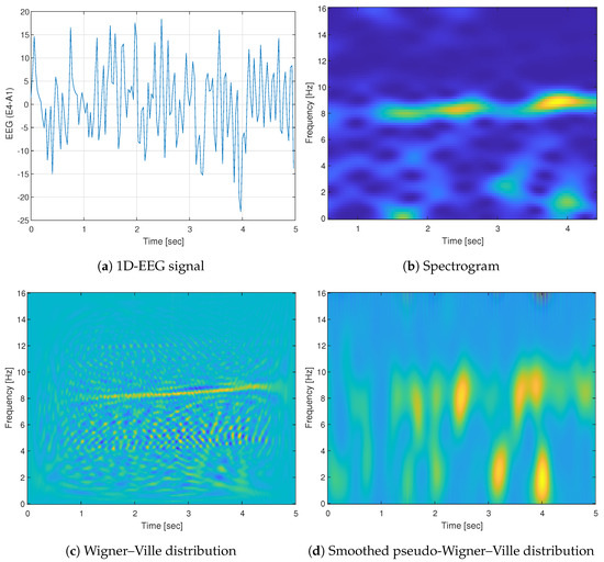 Figure 5 demonstrates the abovementioned forms. It shows an example of a 5 s EEG signal taken from CAPSLPDB (patient ’n1’) and its different time-frequency representations. The increased spectral content of the signal, which exists at the low frequencies (up to 2 Hz) and 8 Hz, is reflected from all the different representations. However, it can be seen that Wigner-based representations have a prominent better resolution in time and frequency compared to the spectrogram. Additionally, it presents the interference in visualization caused by the cross-terms when using WVD, and the mitigation to that problem comes by employing an SPWVD technique.