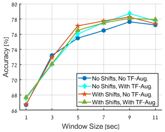 Table 4. Accuracy results (%) for different data augmentations and extensions of the dataset. In each cell, the upper result refers to the validation set performance, while the lower result refers to the test set performance. In each column, the highest results are highlighted. The results demonstrate the effectiveness of integrating data augmentation. Notably, the highest accuracy (78.72%) was achieved using the proposed TF-augmentations with a 9 s window size.