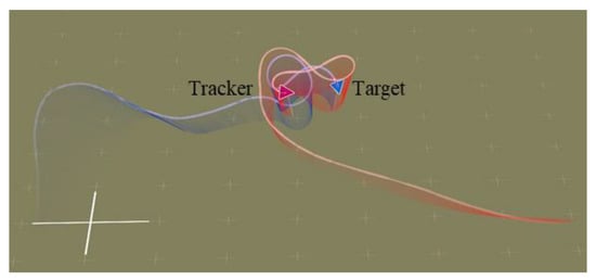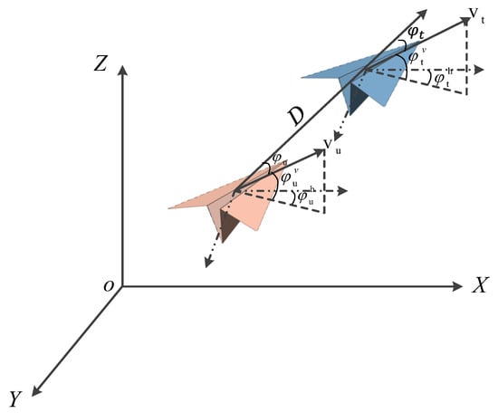 Where and represent the velocity vectors of the tracker and target in the geographic coordinate system, respectively, with scalar forms and . represents the vector expression of the line that connects the center of gravity of the tracker and the center of gravity of the target in the geographic coordinate system, and its scalar form is . As shown in Figure 2, is the angle between vector and , while is the angle between vector and .