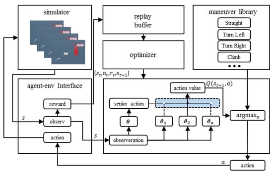 - Chen, Y.; Zhang, J.; Yang, Q.; Zhou, Y.; Shi, G.; Wu, Y. Design and Verification of UAV Maneuver Decision Simulation System Based on Deep Q-learning Network. In Proceedings of the 2020 16th International Conference on Control, Automation, Robotics and Vision (ICARCV), Shenzhen, China, 13 December 2020; IEEE: New York, NY, USA, 2020; pp. 817–823. [Google Scholar] [CrossRef]
