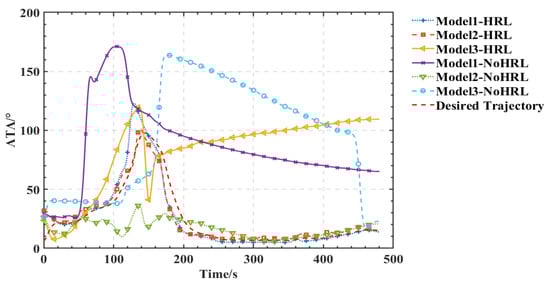 Angle tracking performance: comparison of models ((a–f) represents the horizontal tracking trajectory of model 1 with HRL framework, the horizontal tracking trajectory of model 2 with HRL framework, the horizontal tracking trajectory of model 3 with HRL framework, the horizontal tracking trajectory of model 1 without HRL framework, the horizontal tracking trajectory of model 2 without HRL framework, and the horizontal tracking trajectory of model 3 without HRL framework, respectively).