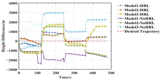 Comparison of the height tracking performance of the models ((a–f) represents the vertical tracking trajectory of model 1 with HRL frame, the vertical tracking trajectory of model 2 with HRL frame, the vertical tracking trajectory of model 3 with HRL frame, the vertical tracking trajectory of model 1 without HRL frame, the vertical tracking trajectory of model 2 without HRL frame, and the vertical tracking trajectory of model 3 without HRL frame, respectively).