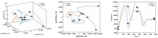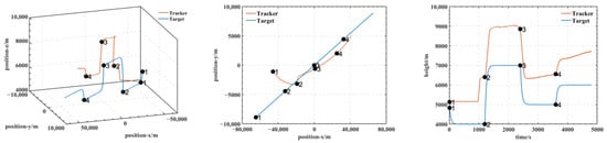 As shown in Figure 5, Figure 6, Figure 7 and Figure 8, we deploy the algorithm of this paper in a typical air combat scenario and compare its tracking of the target aircraft with a model that does not use this algorithm. During air combat, continuous tracking of the target aircraft in a given scenario is necessary to shoot it down. In the test cases, the target aircraft maneuvers continuously at altitude and moves away from the tracker by turning away from it, as seen in the 3D and 2D tracking trajectories, but the tracker ensures continuous alignment with the target in both altitude and direction. In contrast, the use of the other model fails to achieve continuous tracking of the target in either direction or altitude. Furthermore, the red dashed line in Figure 6 and Figure 8 shows the desired tracking trajectory for the target.