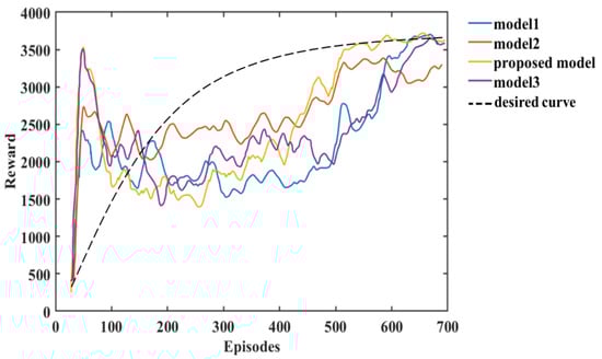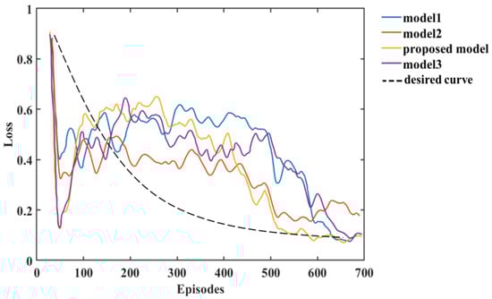 In addition, the corresponding to the selector can be learned from the subvector, but due to the large amount of training data required to train , as performs stochastic exploration, the variance is large, resulting in a decrease in until accumulates sufficiently to train a valid parameter. Furthermore, model 2 can maintain a more stable exploration-utilization capability throughout the training process, but the model proposed in this paper has a higher final reward value compared to the other models due to a better memory of what has been learned. Finally, we use black dashed lines in Figure 13 and Figure 14 to show the variation of reward and loss with the training process in the ideal case.