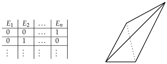 In the 19th century, the philosopher and mathematical logician, George Boole, described a number of what he called ‘conditions of possible experience’ in relation to the observation of statistical data that, he argued, are such that “[w]hen satisfied they indicate that the data may have, when not satisfied they indicate that the data cannot have resulted from an actual observation.” ([32] (p. 229), cited in [33] (p. 100)). Boole explicates the concept in the following way (the notation is Pitowsky’s): given the rational numbers , …, representing the relative frequencies of n in general logically connected events , …, (Pitowsky [33] (p. 2) gives the following example: E1: it will rain in Paris tomorrow; E2: it will rain in Madrid tomorrow; E3: it will rain in Paris and in Madrid tomorrow), the conditions of possible experience with respect to that data are the necessary and sufficient conditions under which the can be realised as probabilities corresponding to the in some probability space. They are yielded by the following algorithm: begin by writing down a ‘truth table’ (see Figure 1) whose rows are the vectors, , …, , describing the consistent assignments (given their logical connections) of extremal probabilities to , …, . Now take the convex hull of these vectors. This yields a polytope, the facets of which are associated with a number of linear inequalities, special cases of which include the one associated with John S. Bell and its variants [33] (pp. 103–104).