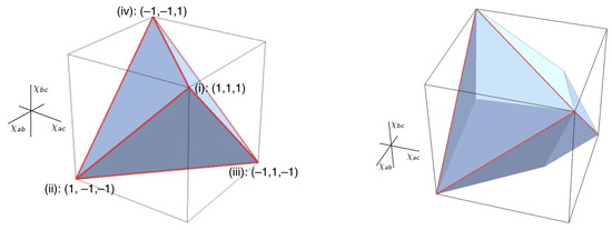 where , and are real numbers. Modelling Equation (2) in a local hidden-variable theory requires a joint probability distribution over the possible values of X, Y and Z. When there are two possible values per variable, the possible probabilistic correlations between X, Y and Z are describable geometrically as a tetrahedron (see Figure 3) lying entirely within the elliptope. When there are three or more values per variable, the associated polyhedra become further and further faceted and more closely approximate the elliptope, but become exceedingly difficult to compute. In contrast to a local hidden-variable theory, quantum theory (as John von Neumann observed in [37]) allows us to assign a value to a sum of observable quantities—represented, for instance, by an operator —without, in general, requiring that we assign values to the individual summands , and (cf. [26] (p. 376)). Janas, Cuffaro & Janssen show how, as a consequence, the probabilistic correlations describable in quantum mechanics saturate the entire elliptope—already for spin- systems (the analogue of a two-valued variable) as well as for all higher values of spin.