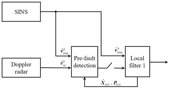 The above is the residual chi-square test. Both the Doppler radar and odometer outputs are in the b-frame, and the SINS navigation solution takes the n-frame as the reference datum. The Doppler radar and odometer construct a measurement by to project its output into the n-frame. Once the Doppler radar or odometer fails, it is bound to directly affect the estimation of . Therefore, the residual chi-square test in b-frame is more conducive to detecting and isolating Doppler radar and odometer errors. In this paper, before Doppler radar and odometer outputs are input into the local filter, the equivalent residual is constructed in the b-frame, and the residual chi-square test is performed to detect and isolate the abrupt faults, so as to avoid the fault information affecting the subsequent filter estimation accuracy.