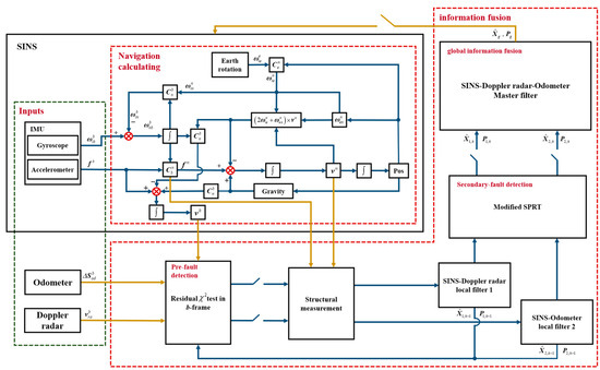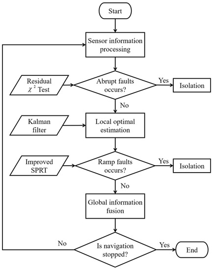 In order to achieve high accuracy, autonomy, and reliability of integrated navigation in the battlefield environment, the federal Kalman filter can be used to fuse the output of SINS, Doppler radar, and odometer to form an SINS/Doppler radar/odometer integrated navigation system [13,14,15,16,17]. To provide the integrated navigation system with better fault-tolerant performance and to achieve stable navigation in case of sensor failure, the system needs to have the ability to detect, isolate, and recover from faults in a timely manner [18,19,20,21]. Xiong used the simplified state chi-square test (SSCST) for fault detection based on the federal filter, and also designed an adaptive shared factor algorithm that can reflect the state of each local filter [22]. This enables the integrated navigation system to maintain stable operation even when the fault occurs by improving the information distribution process of the federal filter. SSCST is highly sensitive to abrupt faults, but less sensitive to ramp faults. When ramp faults occur, they cannot be detected and isolated in time, which may lead to a decrease in positioning accuracy or even divergence [23,24]. Wang proposed a joint fault detection method combining both chi-square test and sequential probability ratio test (SPRT), and compensated for the SPRT’s inability to accurately determine the fault end time and the possible loss of the next fault detection capability through a feedback reset strategy [25]. However, if the ramp fault remains at a small value that cannot be detected by the chi-square test until the end, the correction of the fault statistics cannot be completed by the feedback reset strategy, which is prone to the problem of false detection [26,27]. Yue proposed an integrated navigation system based on adaptive federal filter and detected outliers of the local filter by a fuzzy logic outlier detection algorithm [28]. However, a large amount of priori information is needed to determine the fuzzy rules used for fault detection before applying this method, which increases the difficulty of using the algorithm [29]. Liu constructed three modules of redundant information for mutual comparison to detection sensor fault, and designed a new fault-tolerant filter structure to complete the global information fusion [30], but this method requires a high number of information sources and requires several redundant information comparisons to complete the fault detection.