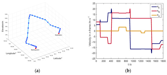 The vehicle trajectory and velocity curve are shown in Figure 5. The marked points in Figure 5a show the position of the vehicle every 50 s.
