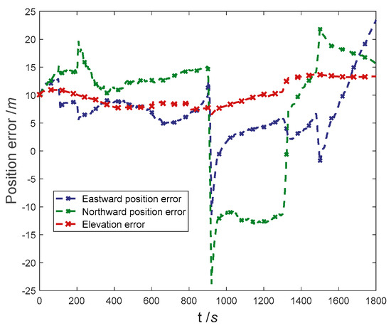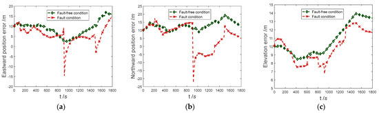 The positioning error curve of the proposed method in the case of sensors with complex faults occurring and sensors trouble-free is shown in Figure 6. It can be seen that the trend of the position error curve before and after the error is almost consistent. At 900 s, due to the abrupt faults of Doppler radar, the eastern and northern positioning accuracy suddenly changed, the east positioning error suddenly diverged to −14.61 m, and the north positioning error suddenly diverged to −21.56 m.