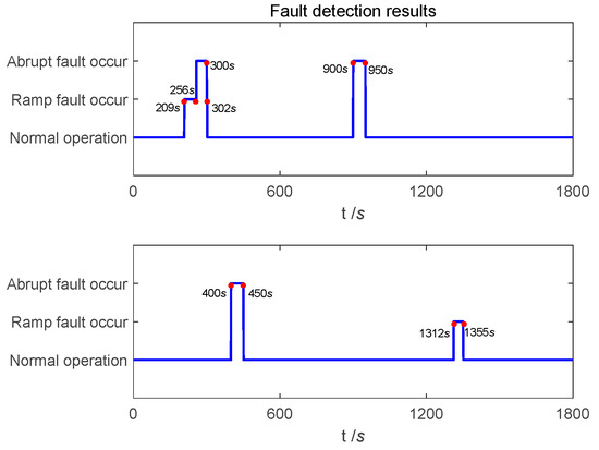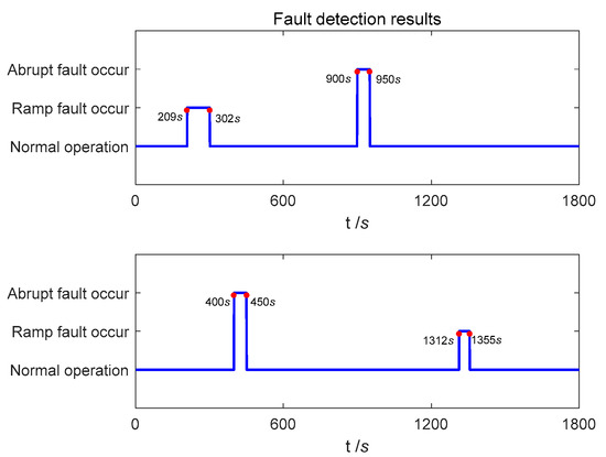 The residual chi-square test constructs a fault detection function through the output at the current moment. It has a good detection effect on abrupt faults. However, with the residual chi-square test it is difficult to detect ramp faults in time, which may cause a missed alarm. SPRT adopts an iterative method to construct fault statistics. It fully utilizes historical statistical information and has high sensitivity to ramp faults. Therefore, there is complementarity between the two fault detection algorithms. This paper combines two fault detection algorithms to ensure the accuracy of fault detection and the timeliness of fault recovery.