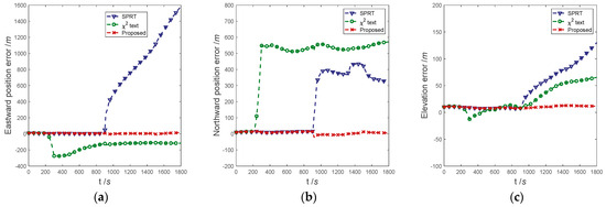 The positioning error curves of the three methods are shown in Figure 8. It can be seen that the positioning error of the proposed method in the fault case has been maintained at a low level. The positioning error of the residual chi-square test diverges rapidly when the Doppler radar has ramp faults (200–300 s). In the subsequent navigation process, the eastward position error converges slightly, the northward position error remains almost unchanged, and the elevation error continues to diverge. Since the SPRT fault statistics do not return to normal, secondary-fault detection cannot be performed; the positioning error of the SPRT begins to diverge rapidly after the Doppler radar abrupt fault (900 s). The subsequent positioning error remains divergent until the end of navigation.