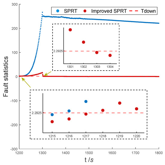 The SPRT historical fault statistics still affect the fault statistics after the fault ends, and the new fault-free measurement has little effect on the fault statistics. Therefore, the traditional SPRT has trouble detecting the fault end time. It is easy to cause a false alarm. In order to overcome the above deficiency, the fault statistic in Equation (41) is rewritten into an iterative form, and a forgetting factor a is introduced before the historical fault statistics: