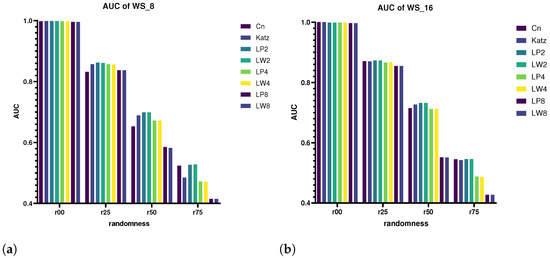 Figure 4). Note that accuracies are measured according to the AUC value. The number of nodes of the networks are all 2000. According to the WS model, each node is set to connect to the nearest 8 and 16 neighbors and they are denoted as WS_8 and WS_16, respectively. The probabilities of link reconnection are set to 0.0, 0.25, 0.50 and 0.75 and they are denoted as r00, r25, r50 and r75, respectively. So, eight kinds of networks in total were generated here.