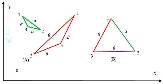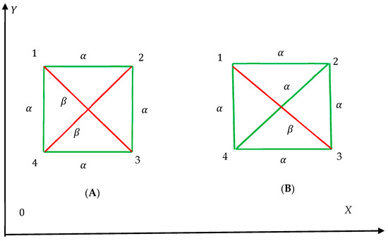 - The Shannon entropies are insensitive to the exact shapes of the polygons appearing in the graph (only the number of polygon sides is taken into account), as illustrated in Figure 3. The graphs depicted in insets Figure 2A,B are quantified with the same values of the Shannon entropies introduced with Equations (3) and (4) and Equation (8). Only the polygon-type distribution influences the values of the Shannon entropies.